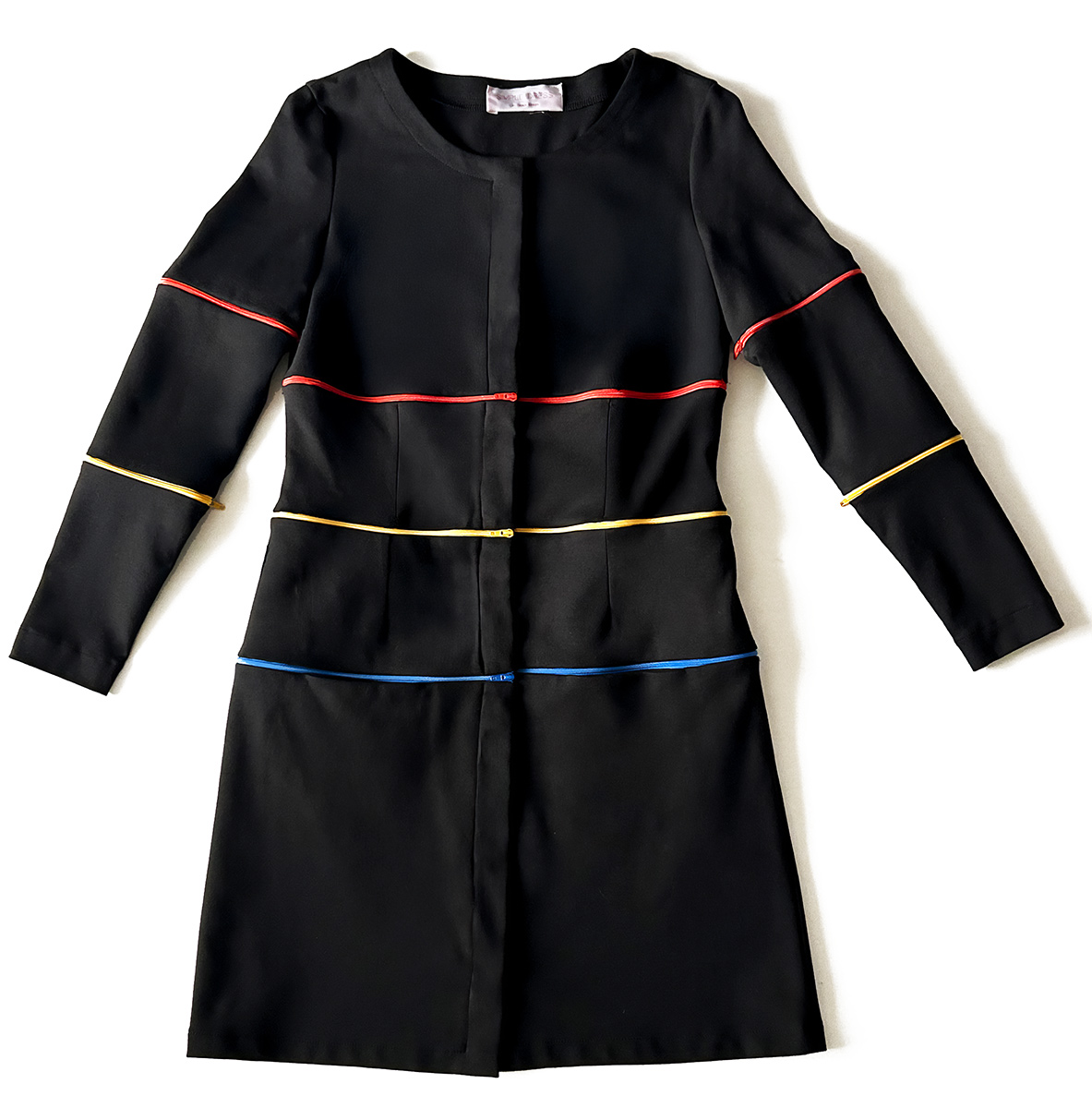Stelle dir dein Outfit durch das Reißverschlusskonzept individuell selbst zusammen. Alles ist möglich – Rock solo, Mantel, Jacke, kurzarm, 3/4-arm oder langarm. Sie erhalten hier fünf Kleidungsstücke in einem Kleid.