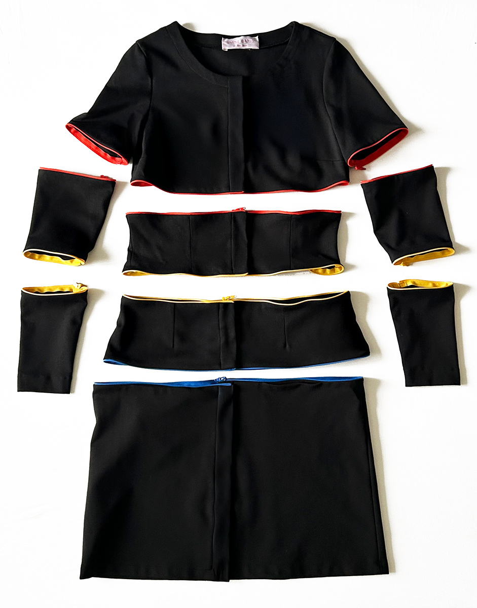 Stelle dir dein Outfit durch das Reißverschlusskonzept individuell selbst zusammen. Alles ist möglich – Rock solo, Mantel, Jacke, kurzarm, 3/4-arm oder langarm. Sie haben fünf Kleidungsstücke in einem Kleid.